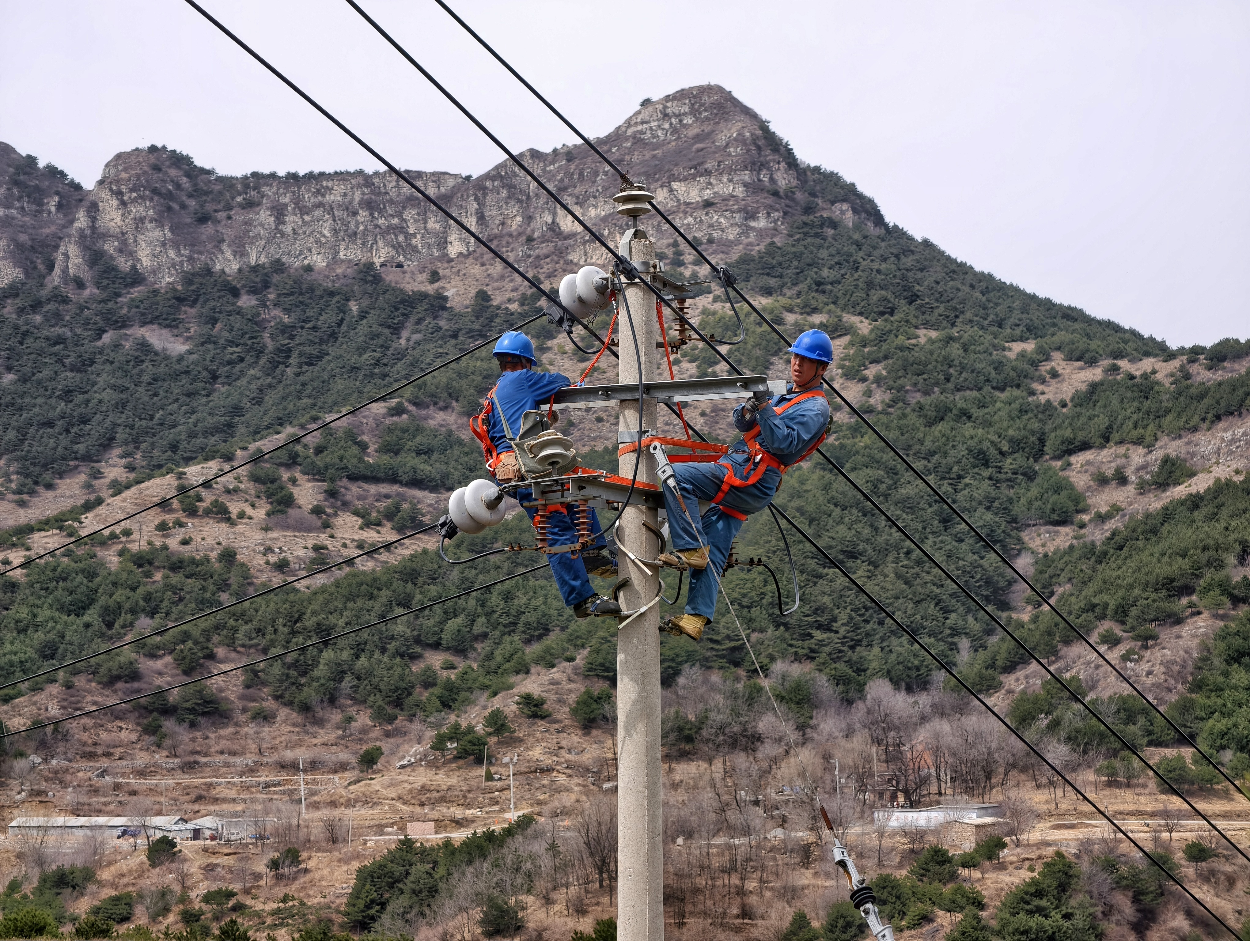 3月26日,國(guó)網(wǎng)長(zhǎng)治平順縣供電公司員工在10千伏玉峽關(guān)線開(kāi)展防火雙橫擔(dān)改造春檢作業(yè)。郭海波 攝